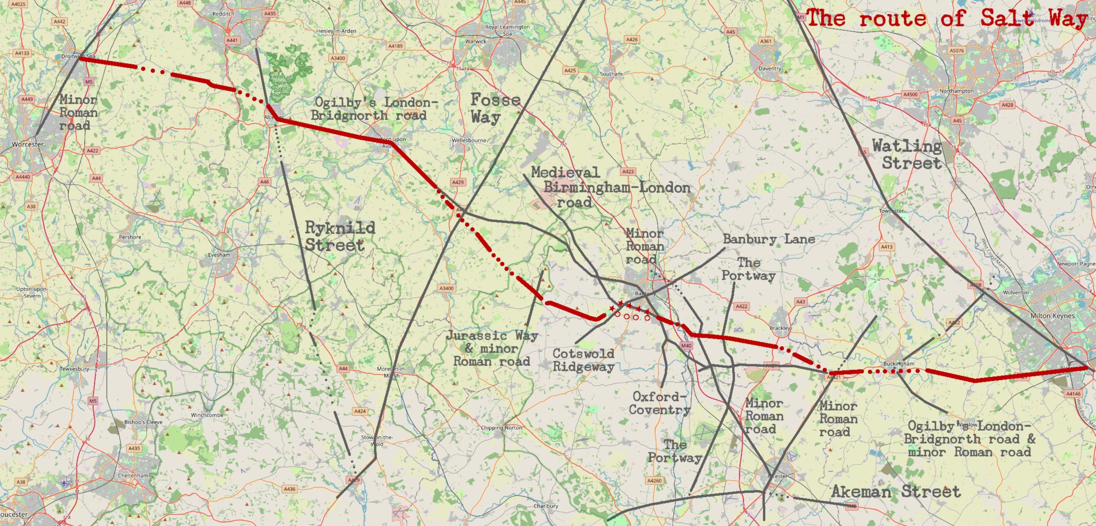 The brine was dried to make solid salt and transported South-east along a new strait meaning street (click map right). In modern times this has been given the name The Salt Way because it’s Roman name has not yet been found written down. From Droitwich it passed through Alcester and Banbury on the way to Londinium (Stratford didn’t exist at that time).