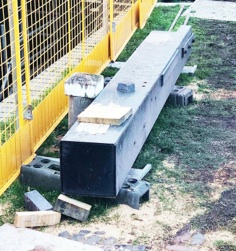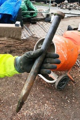 Next the old Corp Cill Nails [9] and Corp Cill [not shown] were removed. The top of the fore bay was chipped out with a pneumatic drill [10] - notice the reinforcing wires had been kept for later (dangling lower in picture). Then the new Corp Cill installed somewhat within the brickwork but nothing like as deeply as the main cill which just can’t be seen. To protect against rolling (see Installing Corp Cills on Lock Construction page) extra-long new Corp Cill nails with barbs [11] were banged in with a sledge hammer.