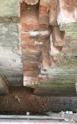 A preliminary team was called in. They emptied the pounds above and below the lock ie water was passed straight through this lock and the one below it [2, 3]. They made holes in the walls where necessary and inserted an injector nozzle. To this they attached a hose to a large funnel held up at ground level. Into this they poured special sealing grout to run into the earth behind the bricks to seal the ground. This is a common method used in tunneling. However with one major difference: in tunneling, for instance, when injecting into London’s gravel to stabilise around the new Jubilee Line train tunnels, they pumped vast quantities at high pressure. In this location C&RT had to be far more circumspect with the volume and pressure otherwise the entire wall could be heaved into a heap at the bottom of the lock chamber (remember the walls are a double thickness of bricks bound with ‘stretchers and headers’ as the best brickies know). The brickwork was raked out with a machine and large areas of brick re-mortared into place. Now that the culvert had been dry for some time that was also repaired.