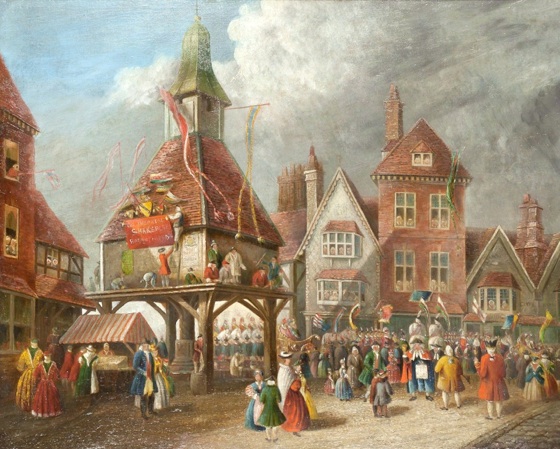 Two depictions in the same vane: Market Cross in the year of Garrick’s Shakespeare’s Jubilee 1769. Left oil on canvass; right hand coloured engraving 1864 ©SBT.