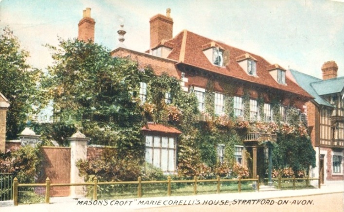 In 1897 the successful novelist Marie Corelli (see shortcut above) was living in Kensington and had had a very severe illness. She had also grown weary of petty rumour spread about her and so sought out residence in the quiet end of a town that she greatly admired. She first rented Halls Croft and then the Dower House. In 1900 she bought Masons Croft. Structurally she kept the house very much the same but encouraged a great deal of greenery to grow front and rear (see below left). Eventually she had a Summer House built to the rear.