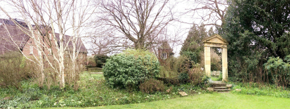 The rear garden is maintained well. The is a summer house through the stone arch.