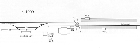 In 1859 the station was opened by the Oxford, Worcester and Wolverhampton Railway on a single track branch line. The Great Western Railway bought out the OWWR and in 1908 doubled the line between Stratford and Honeybourne making this the new Main Line from Birmingham to Cheltenham and South Wales where huge goods trains were destined. As the only form of public transport in the area a second platform was added.