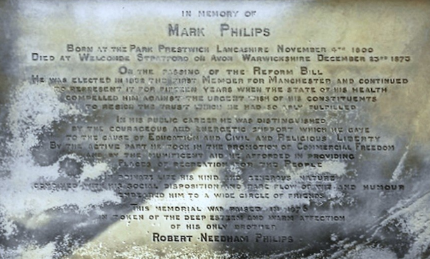 Mark Philips (4 November 1800 – 23 December 1873) was an English Liberal Party politician, and one of the first pair of Members of Parliament for Manchester after the Great Reform Act. Born in Philips Park, Whitefield, Lancashire, the son of Robert Philips, a prosperous merchant and Anne Needham. He was educated at the Manchester Academy while it was in York and then at the University of Glasgow.